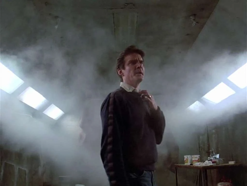 Angelo in the paint booth with the thinner being released. Dominic and Hawke are out of the camera view as they are trying to force the door open.